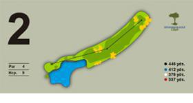 El 2 es un largo par 4 de 446 yardas, dogleg a la izquierda, con fuera de límites a la derecha y a la izquierda, y4 grandes cross bunkers que achican el fairway a la altura del drive. Poseeademás, una amplia laguna sobre la derecha, a la altura de los tees de salida que le dan un marco de amplitud. Desde el tee de campeonato el tiro debe ser muy preciso ya que sobrevuela la gran laguna y se enfrenta a los cross bunkers. El segundo tiro se debe hacer a un green que se encuentra dividido por un pronunciado desnivel en el medio, por lo cual será muy importante acertar la plataforma en que se encuentre la bandera. El green cuenta también con la muy buena defensa de 3 amplios bunkers que lo rodean.