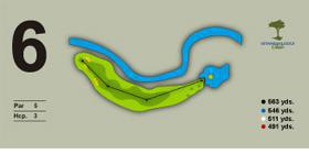 El 6 es un par 5 de 563 yardas con un pronunciado doglega la derecha, recorrido por el Rio Lujan (fuera de límites) desde el tee hasta el Green por el costado derecho. La primer parte del hoyo posee un fairway amplio con un cross bunker sobre el lado izquierdo. El segundo tiro se deberá pegar por encima de un frondoso árbol ubicado casi en el medio del fairway. Un buen golpe ampliará las posibilidades de pegar el tercer tiro a un green amplio, relativamente plano, y con múltiples bunkers alrededor.