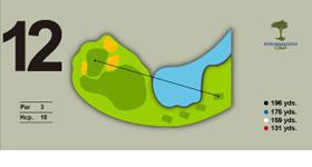 El 12 es un pintoresco par 3 de 196 yardas, con agua delante o a la derecha de los tees, según cuál sea la salida que corresponda. El tiro de salida se hace a un green muy angosto al principio y más ancho al final. Posee 2 plataformas y los más variados movimientos que se pueda imaginar. Otras de las dificultades de este hoyo es que se encuentra bien defendido por 3 bunkers y el fuera de limite a la izquierda.