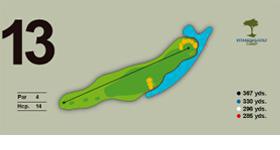El hoyo 13 es un par 4 corto, de 367 yardas, dogleg a la izquierda, con fuera de límites a la izquierda y cross bunkers a la derecha. El tiro más apropiado aquí es una madera 3 corta de los bunkers, de modo de asegurar un segundo tiro de 150 yardasdesde el fairway a un green defendido por lomas, agua y bunkers.