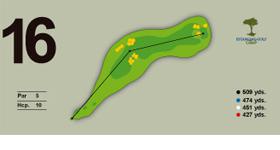 El 16 es un hoyo de birdie. Este corto par 5 tiene 509 yardas y un dogleg a la derecha, tiene al río Luján ubicado sobre la izquierda, frondosos árboles y fuera de límites sobre la derecha, y cross bunkers a la altura del drive. Un buen drive sobre la izquierda dejará libre el camino para intentar llegar al green. El tiro es en subida y el green es pequeño, pero sin grandes obstáculos a su alrededor. Un buen segundo tiro… y todo es posible, hasta tal vez un águila.