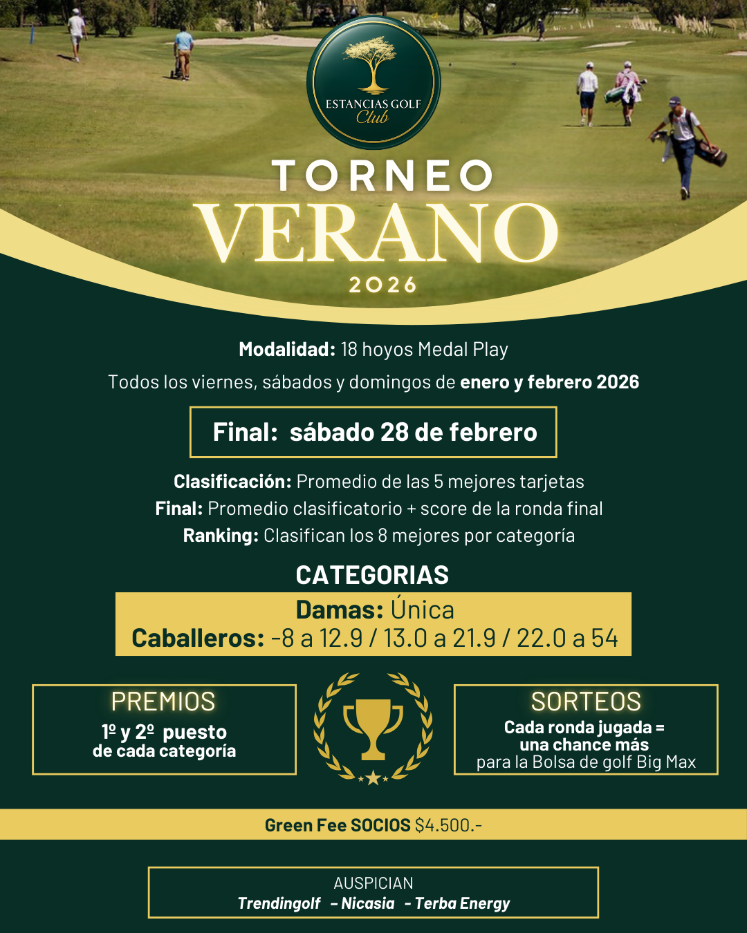 Estimados golfistas, Los invitamos a participar del Torneo de Verano en Estancias Golf Club, que tendrá lugar los viernes, sábados y domingos de enero y febrero.